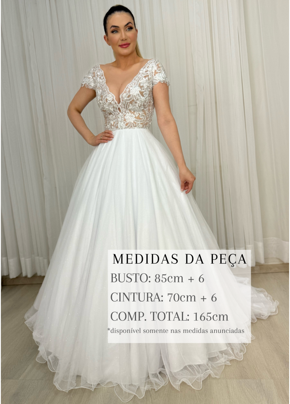 O vestido será disponibilizado apenas nas medidas anunciadas na imagem.